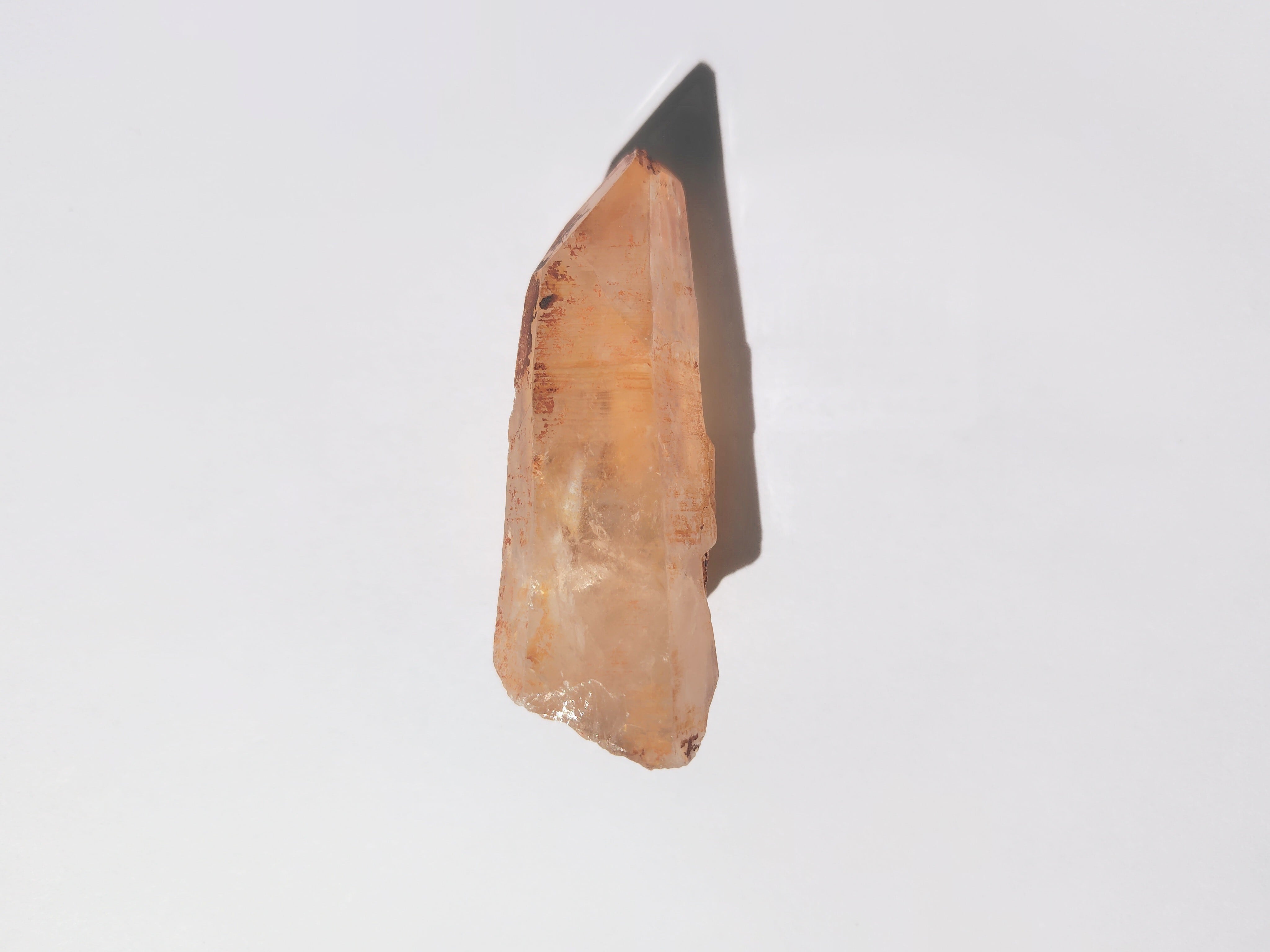 タンジェリンクォーツは、水晶の表面にヘマタイトが自然に付着してできた、やわらかなオレンジ色の石。太陽のようにあたたかく、前向きなエネルギーと創造性・情熱を引き出してくれます。オレンジ色なのは表面だけで、中は透きとおるようにクリア。心に光をともす、明るく元気なストーンです。