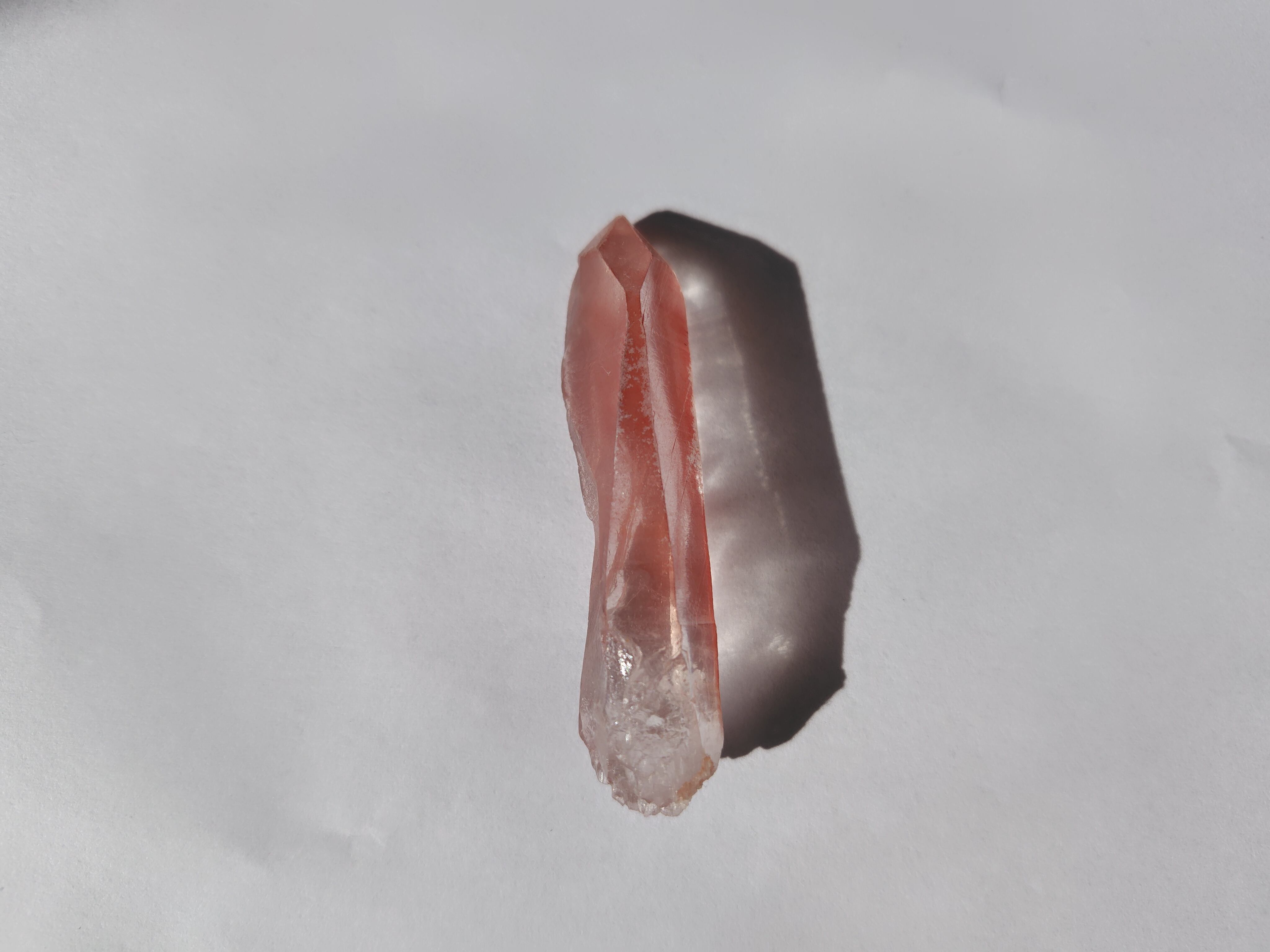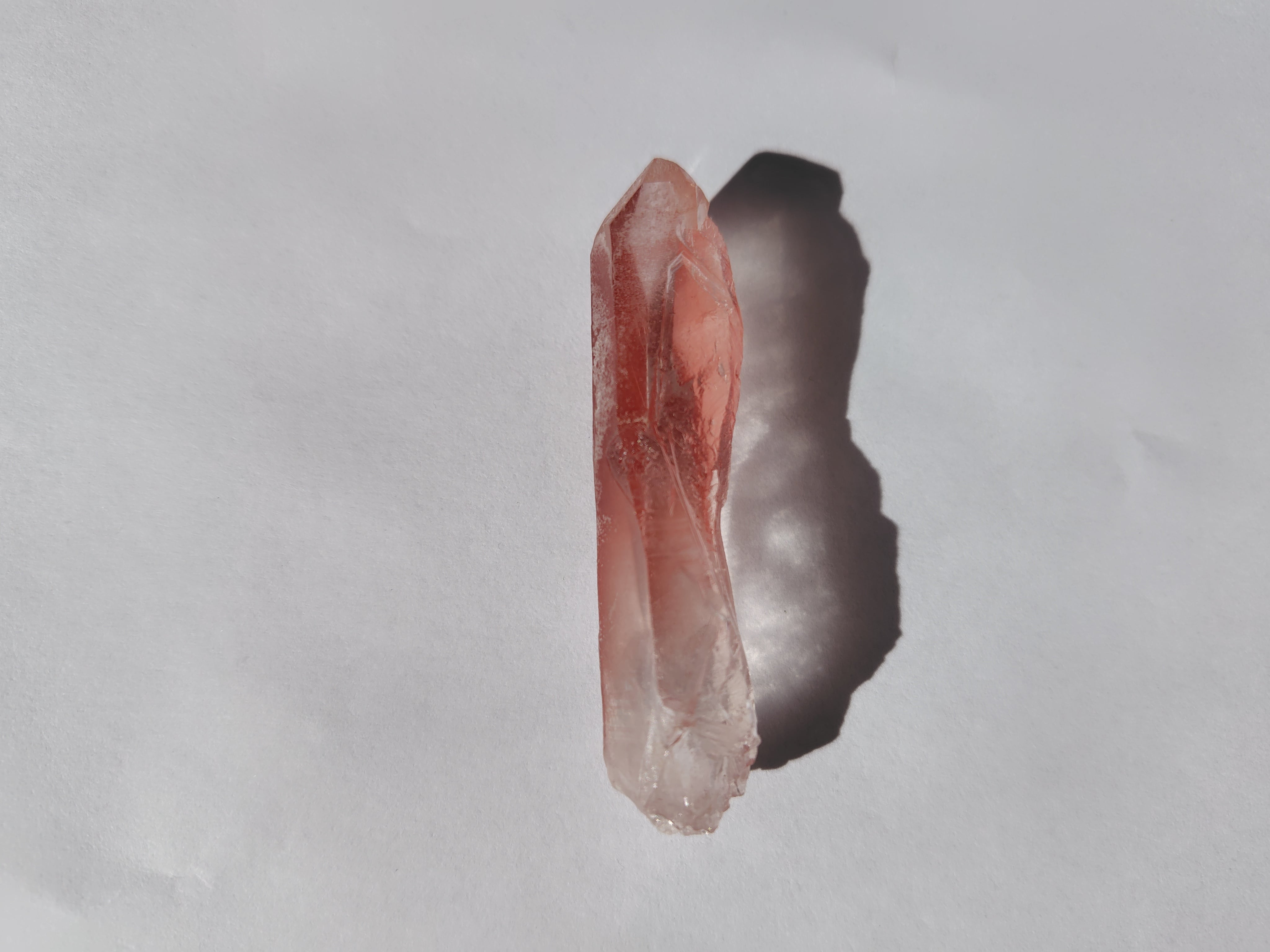 ピンク色のレムリアンクリスタル。鉄分とリチウムなどが結晶を覆い、淡いピンクから赤みを帯びた美しいグラデーションを生み出すピンクレムリアンシードクリスタル。